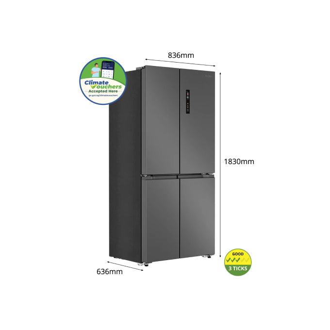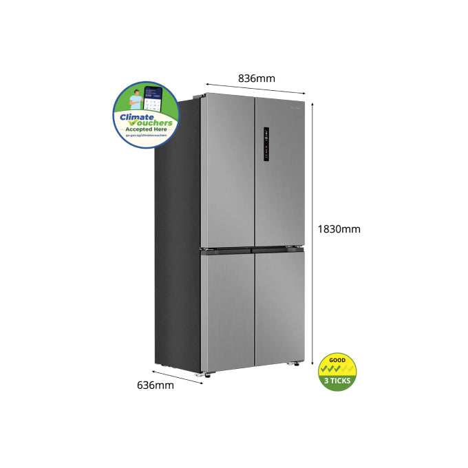Easily organise your groceries with the PureFresh FDR 440 four-door fridge, featuring an accessible top fridge, spacious shelves, and a slim design.
