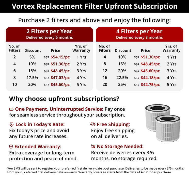 The Vortex Smart Air Purifier proactively tracks usage as your filters collect pollutants and particles. Once it’s time for a replacement, the LED indicator illuminates. A single filter offers efficient and effective protection for up to 12 months.