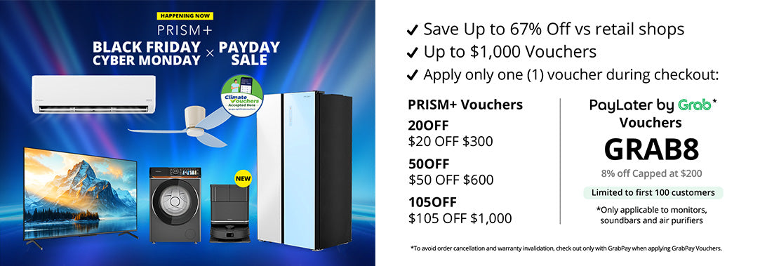 Applicable for purchases of PRISM+ Aircons, Ceiling Fans, Washers or Refrigerators, excluding Dryers & PureFresh TMF 530 (Black Inox).