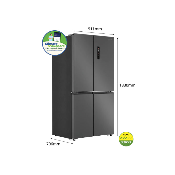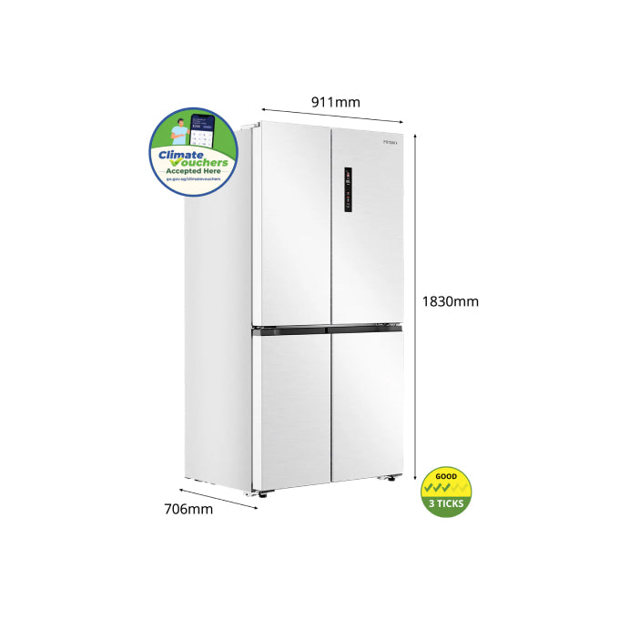 Simplify kitchen life with the spacious PureFresh FDR 570, a four-door fridge featuring an accessible top fridge, bottom freezer, and expansive shelves.